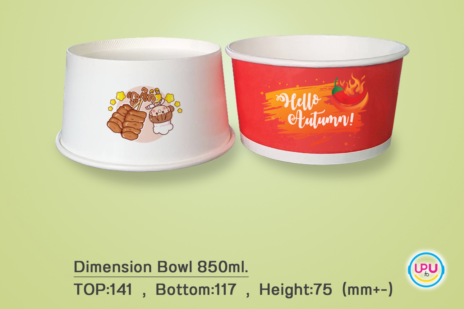 ถ้วยกระดาษ ขนาด 850 ml เหมาะสำหรับบรรจุ อาหารคาว หวาน สลัดผัก ของทอด ซุป ก๋วยเตี๋ยว อาหาร delivery ต่าง ๆ ผลิตจากกระดาษเคลือบ PE หรือ BioPBS คุณภาพสูง ชนิด Food Grade มีให้เลือกทั้งแบบ เคลือบ 1 ด้านสำหรับอาหารร้อน และ เคลือบ 2 ด้านสำหรับอาหารเย็น